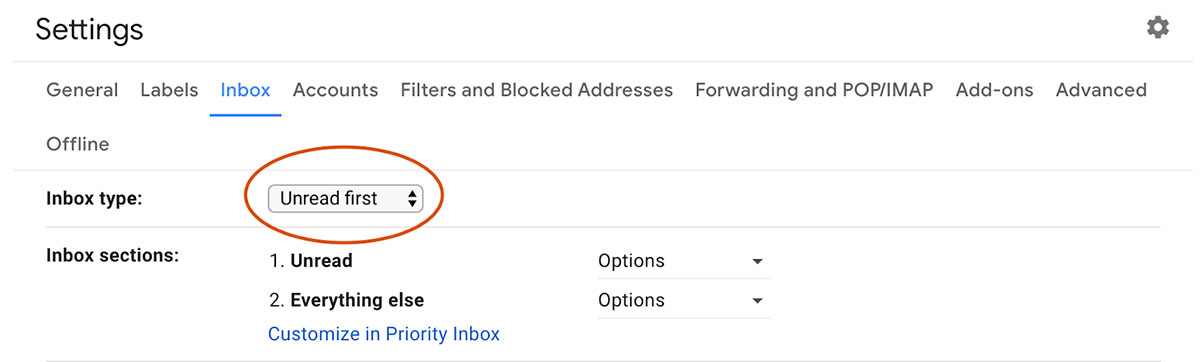 Vé a tu configuración y haz clic en “bandeja de entrada”. En “tipo de bandeja de entrada”, puedes seleccionar la opción “no leídos primero” para crear dos secciones distintas: una para los mensajes no leídos y otra para todos los demás.
