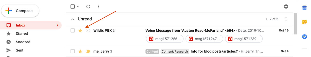 Para clasificar los correos electrónicos más rápidamente, también puedes hacer clic en el icono de la estrella, junto a la casilla de verificación en tus correos electrónicos. Esto clasifica cada mensaje en la categoría “destacada” prefabricada de Gmail.