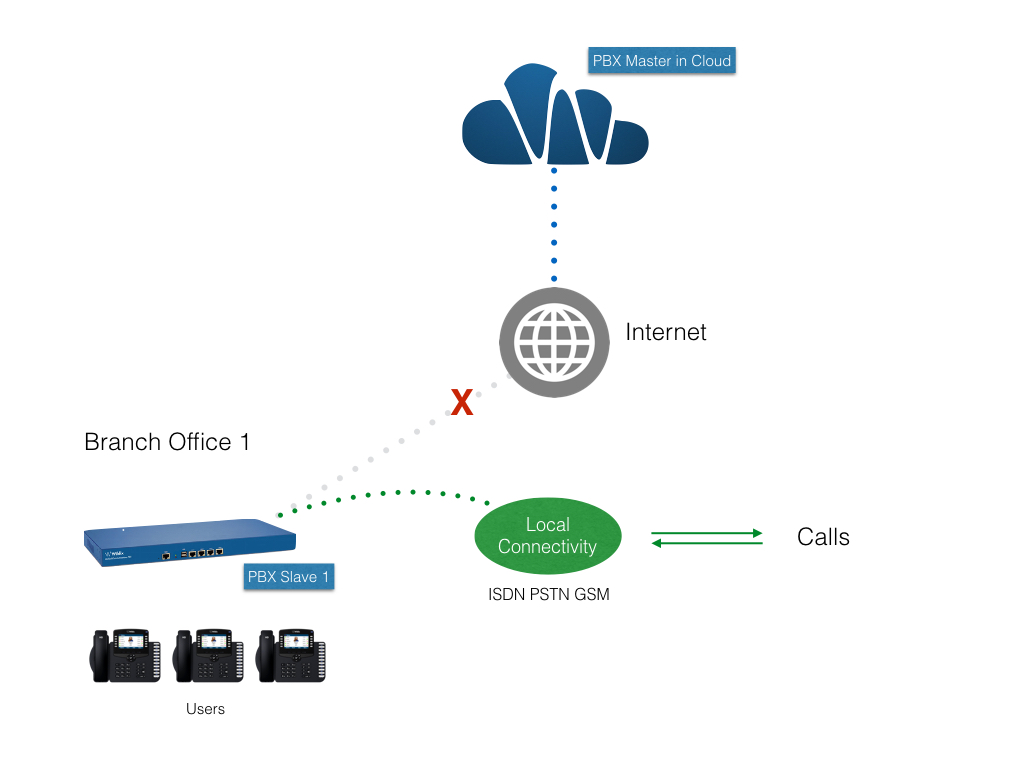 En caso de problemas de acceso a Internet, el PBX Client continúa funcionando correctamente para todos los usuarios de la sede y garantiza la continuidad del servicio de las comunicaciones, desviando las llamadas gracias a la conexión local (líneas telefónicas ISDN, analógicas o red GSM).