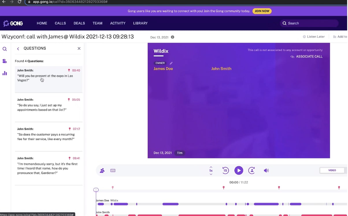 By the end of the call, Gong will have prepared both an audio recording and a written transcript. But of course, it will have a lot more to provide as well: for one thing, it will have already added key contact information from the customer to your CRM, removing the tedious work of manual data entry.
